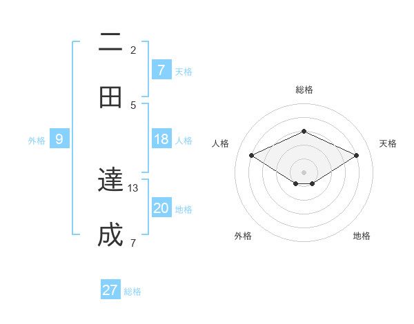 二田 達成さんの総格は27画の3点!