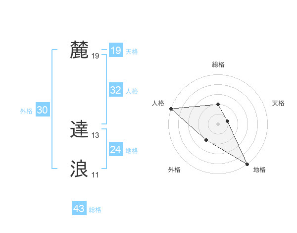 麓 達浪さんの総格は43画の2点!