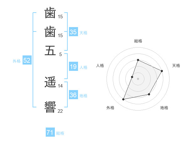 歯歯五 遥響さんの外格は52画の4点!