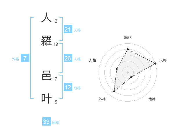 人羅 邑叶さんの天格は21画の5点!