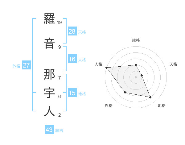 羅音 那宇人さんの総格は43画の2点!