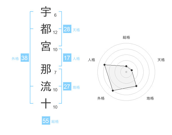 宇都宮 那流十さんを姓名の画数から五運を鑑定