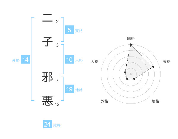 二子 邪悪さんを姓名の画数から五運を鑑定