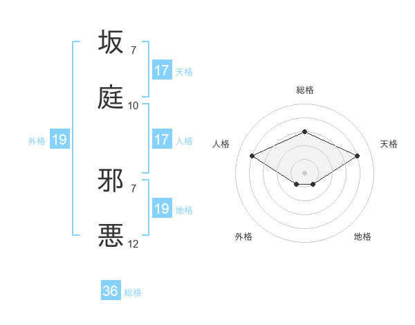 坂庭 邪悪さんを姓名の画数から五運を鑑定