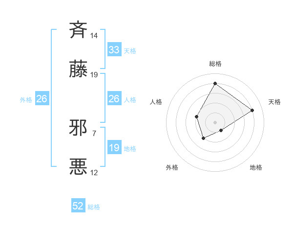 斉藤 邪悪さんの総格は52画の4点!