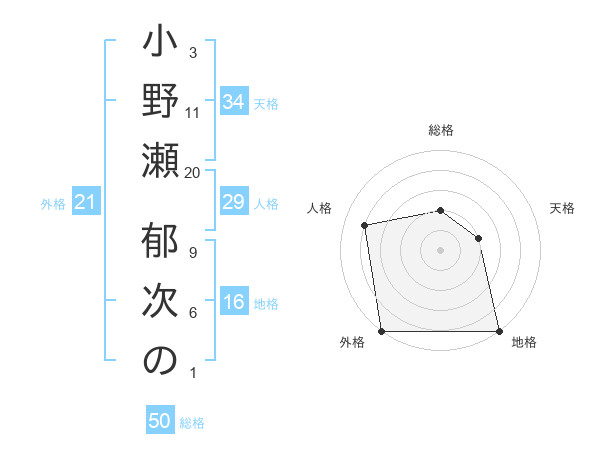 小野瀬 郁次のさんを姓名の画数から五運を鑑定