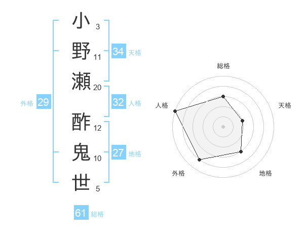 小野瀬 酢鬼世さんの総格は61画の3点!