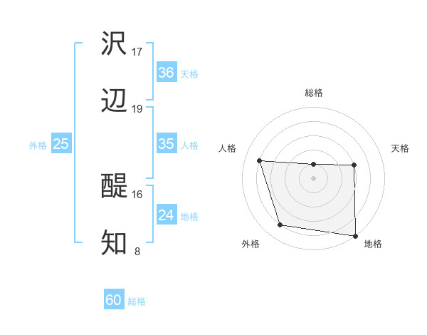 沢辺 醍知さんの総格は60画の1点!
