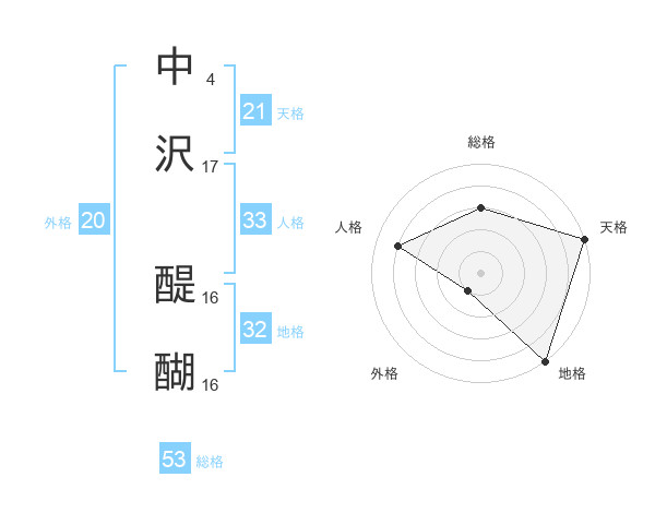 中沢 醍醐さんを姓名の画数から五運を鑑定