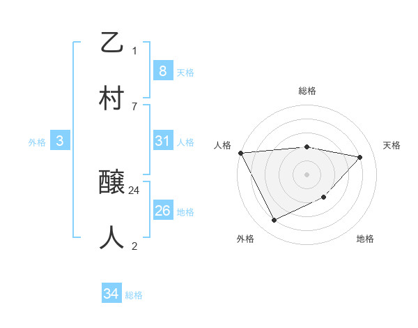 乙村 醸人さんの総格は34画の2点!