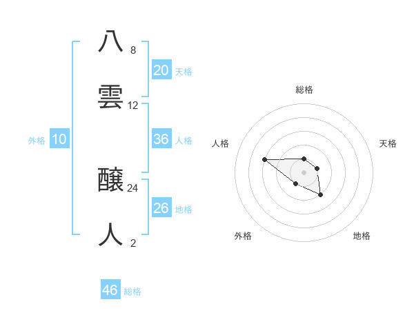 八雲 醸人さんを姓名の画数から五運を鑑定