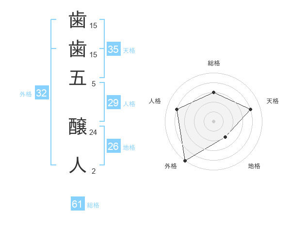 歯歯五 醸人さんを姓名の画数から五運を鑑定