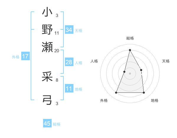小野瀬 采弓さんの総格は45画の4点