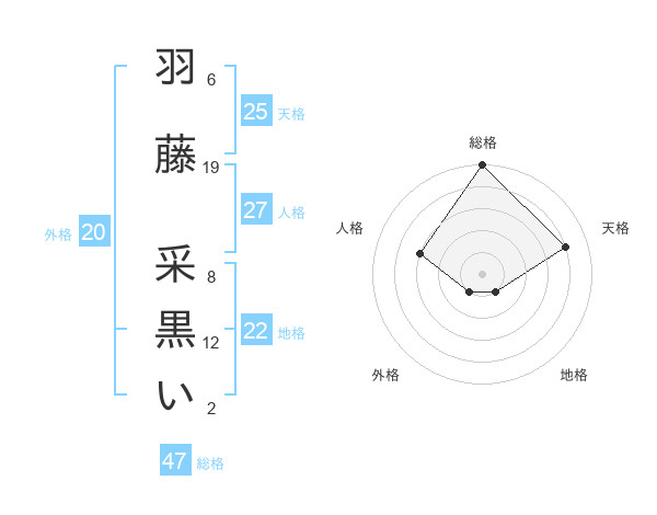 羽藤 采黒いさんの総格は47画の5点!