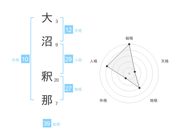 大沼 釈那さんを姓名の画数から五運を鑑定