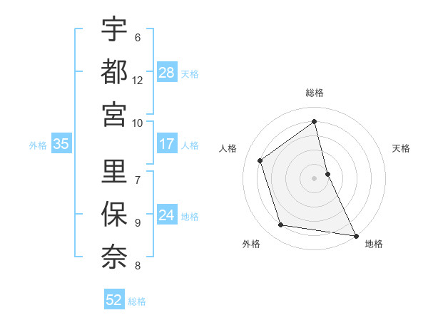 宇都宮 里保奈さんの総格は52画の4点!