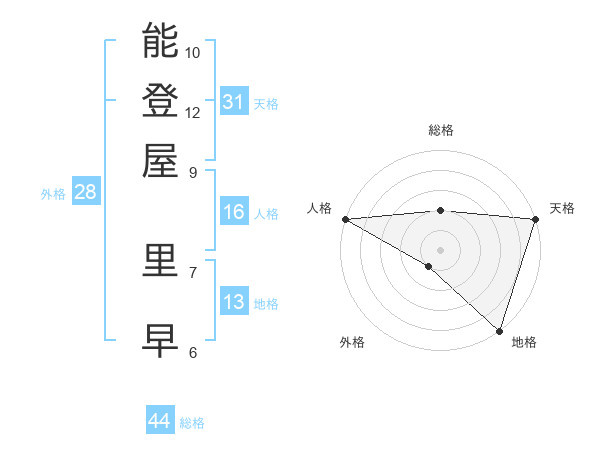 能登屋 里早さんの総格は44画の2点!