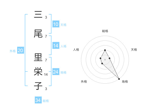 三尾 里栄子さんの総格は34画の2点!