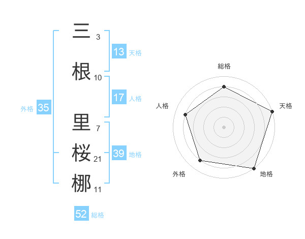 三根 里桜梛さんの総格は52画の4点!