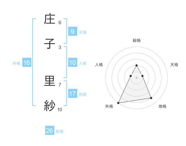 庄子 里紗さんを姓名の画数から五運を鑑定