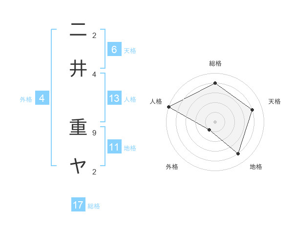 二井 重ヤさんの総格は17画の4点!
