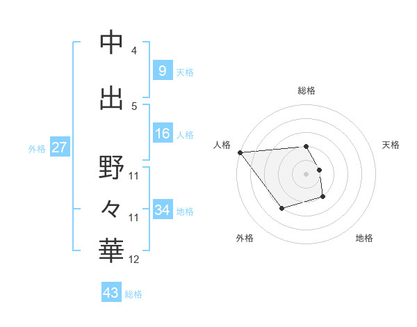 中出 野々華さんの総格は43画の2点!