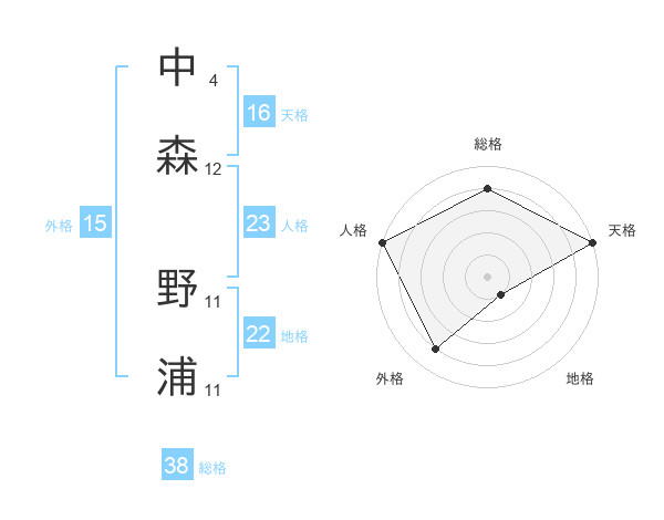 中森 野浦さんの総格は38画の4点