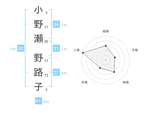 小野瀬 野路子さんの総格は61画の3点