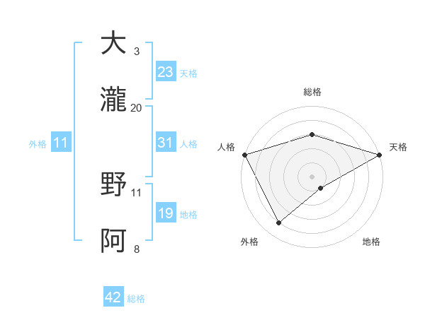 大瀧 野阿さんを姓名の画数から五運を鑑定