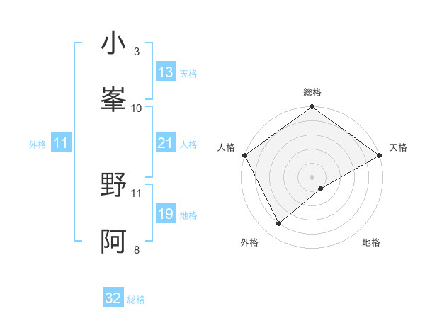 小峯 野阿さんを姓名の画数から五運を鑑定