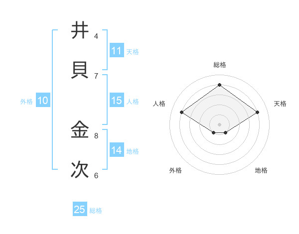 井貝 金次さんの総格は25画の4点!