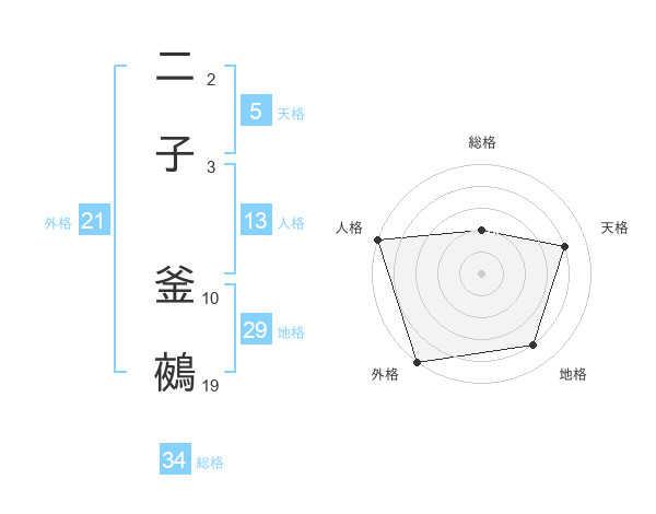 二子 釜鵺さんの総格は34画の2点!