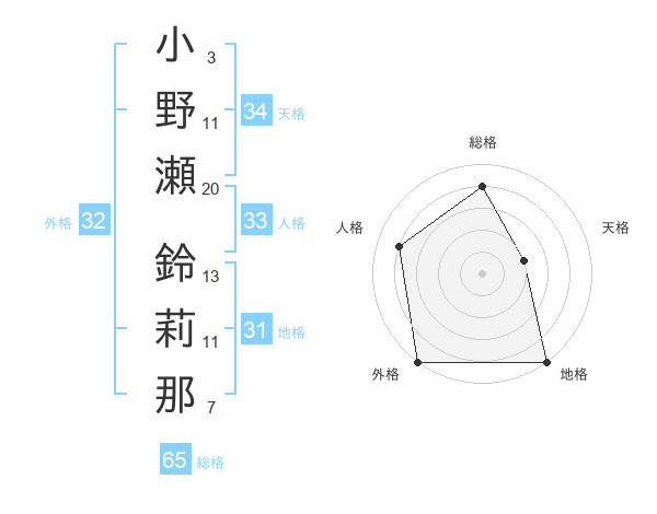 小野瀬 鈴莉那さんの総格は65画の4点!