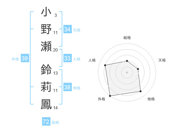 小野瀬 鈴莉鳳さんの総格は72画の2点