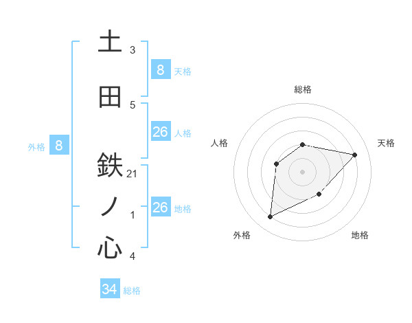 土田 鉄ノ心さんを姓名の画数から五運を鑑定
