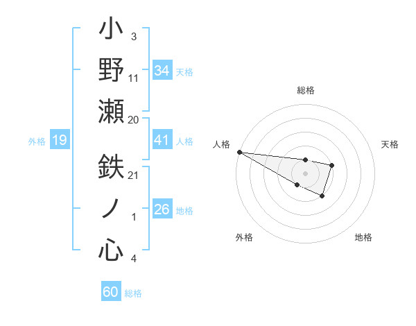 小野瀬 鉄ノ心さんの総格は60画の1点!