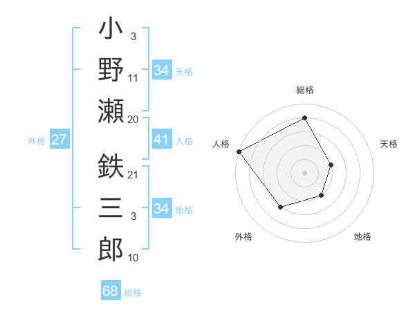 小野瀬 鉄三郎さんの総格は68画の4点!
