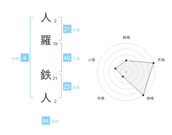 人羅 鉄人さんの総格は44画の2点!