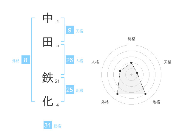 中田 鉄化さんの総格は34画の2点