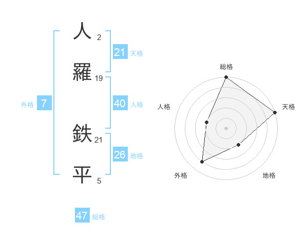 人羅 鉄平さんの総格は47画の5点!