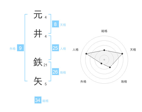 元井 鉄矢さんの天格は8画の4点!