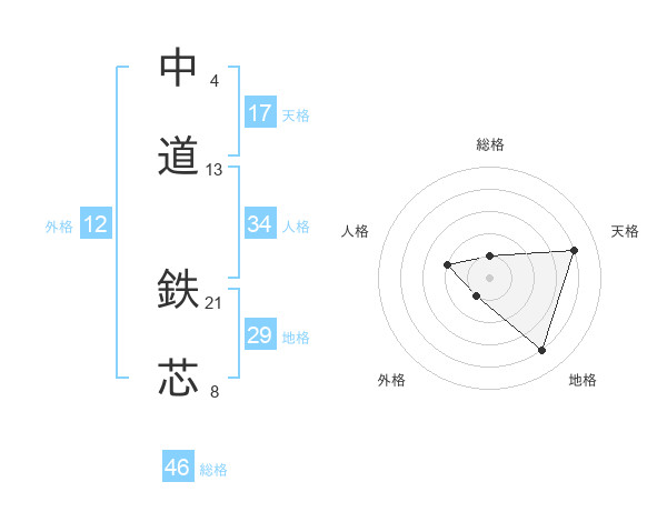 中道 鉄芯さんの天格は17画の4点!