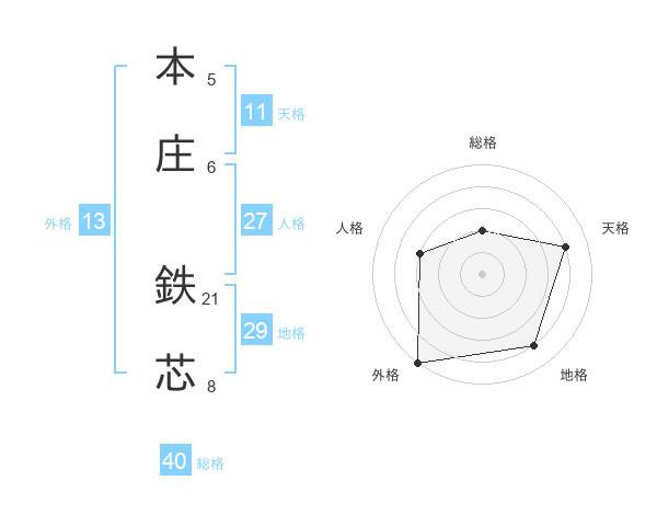 本庄 鉄芯さんの外格は13画の5点!