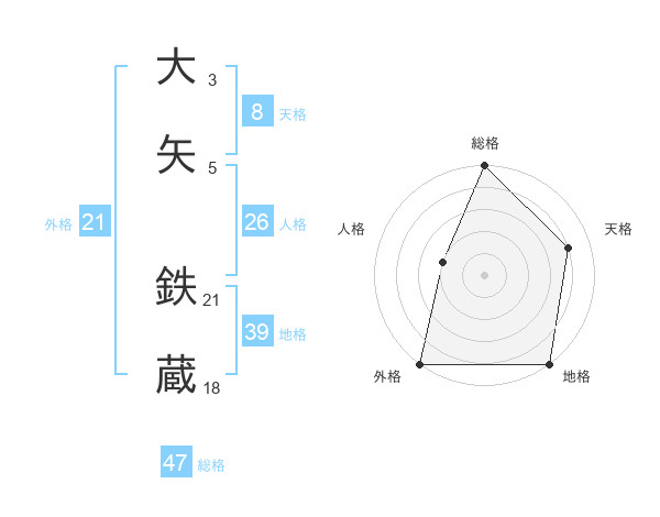 大矢 鉄蔵さんの総格は47画の5点!