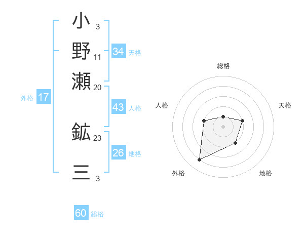 小野瀬 鉱三さんを姓名の画数から五運を鑑定