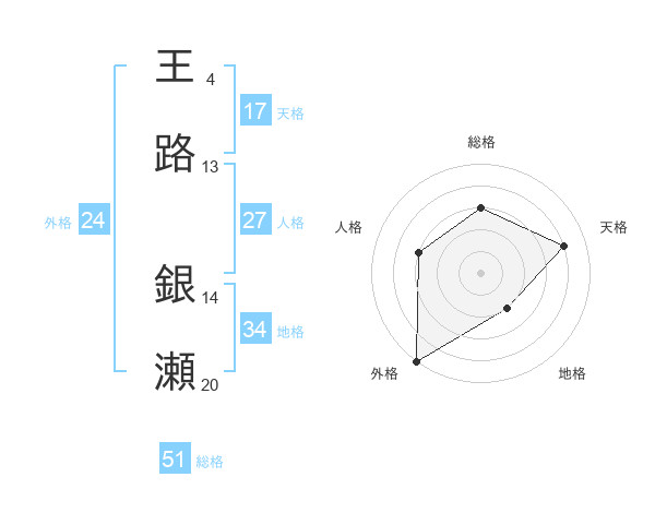 王路 銀瀬さんの天格は17画の4点!