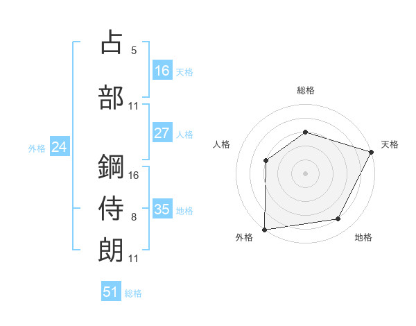 占部 鋼侍朗さんの総格は51画の3点!