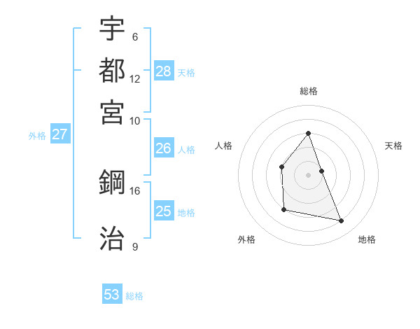 宇都宮 鋼治さんを姓名の画数から五運を鑑定