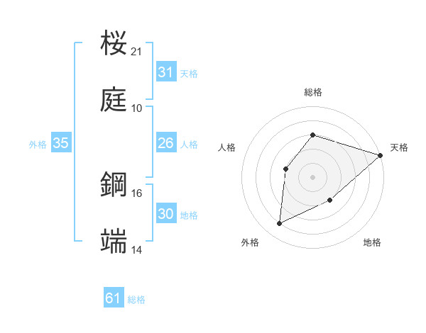 桜庭 鋼端さんの総格は61画の3点!