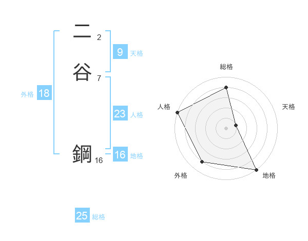 二谷 鋼さんの総格は25画の4点!